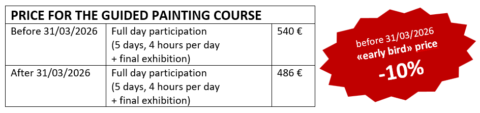The price of the guided painting course is 540€ for 5 days (minimum 4 hours of painting per day, morning and afternoon sessions) including the final show and basic art supplies. You can just join us on place, nothing to carry on.